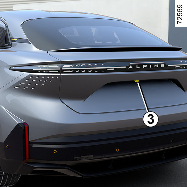Om en släpvagn är monterad och en framåtgående växel är ilagd trycker du på menyn "360°-kamera" i världen Bil på multimediaskärmen 5 för att aktivera kameran 3 för att överföra en bild av omgivningen i ungefär 30 sekunder.