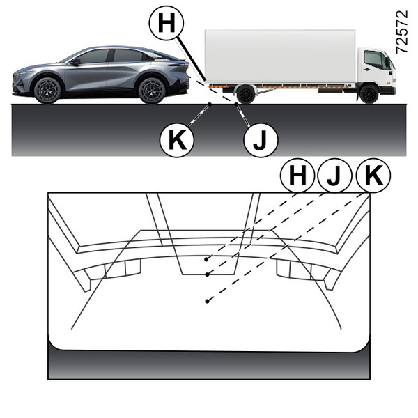 På skärmen verkar positionen H vara längre bort än positionen J. Positionen H är dock på samma avstånd som positionen K.