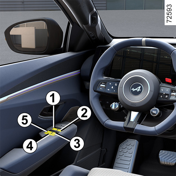 Föraren kan stänga av de bakre fönsterhissarnas funktion genom att trycka på knappen 4. Ett meddelande visas på instrumentpanelen.