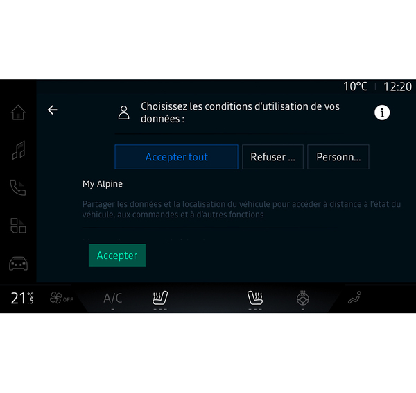- "hepsini reddet", kişisel verilerinizin paylaşımını reddeder ve bağlı hizmetlere erişime veya bunların çalıştırılmasına izin vermez (kaza durumunda otomatik acil durum çağrısının güvenliği ile ilgili düzenleyici işlevler hariç);