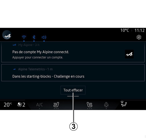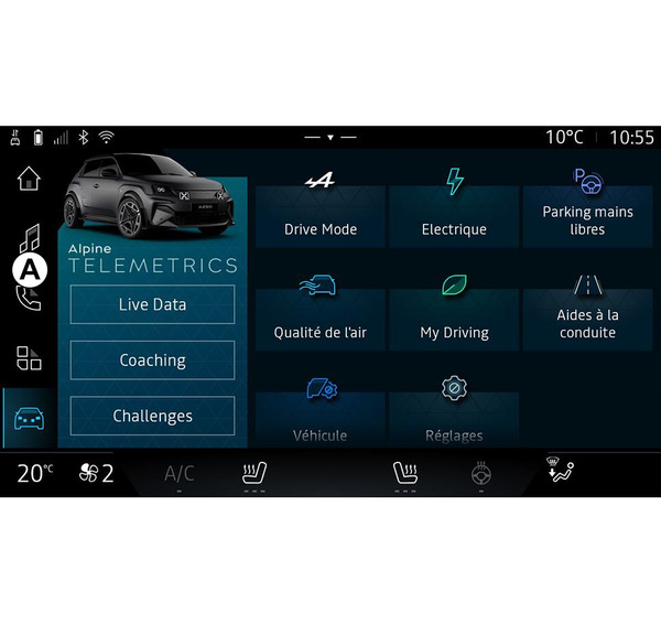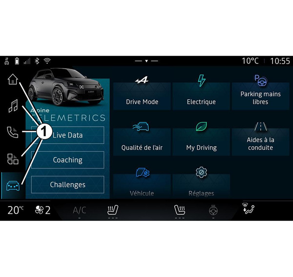 - "Araç": SÜRÜŞ MODU, sürüş yardımları, Alpine Telemetrics gibi bazı araç ekipmanlarını yönetmenizi ve ekran, dil vb. gibi çeşitli multimedya sistemi ayarlarını yapmanızı sağlar.