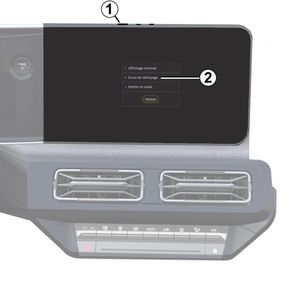 Multimedya sistemi açıkken ekran üzerinde mikro fiber bez kullanmak için multimedya panelindeki 1 kumandasına kısaca basınız, ardından dokunmatik ekranı etkin olmayan moda ayarlamak için "Ekran Temizleme" 2 düğmesine basınız.